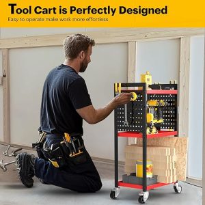 - 4-Tier Storage Expert: Utility cart has 3 tier tray design for preventing items falling off and keeping your items safely. And 1 tier drill rack can hold 8 drills and hand tools, the side pegboard with 14 pcs different types of hooks for organizing screwdrivers and pliers, making reasonable use of storage capacity and quickly classifying tools and accessories