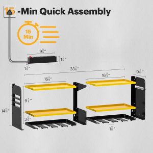 - Ease of assembly and capacity: The tool organizer is made of thickened heavy-duty steel metal, which can be used to quickly assemble a perfect power tool storage rack in 15 minutes. Each layer of the tool shelf can support up to 100LBS