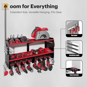- Larger space: The movable power strip provides great convenience for charging your batteries, The side of the tool rack has been equipped with a small tool storage area, designed to hold commonly used drill bits, pliers, hammers, and screwdrivers, comes with 6 hooks for hanging tools such as tape measures or wrenches, adding diversity to your storage options