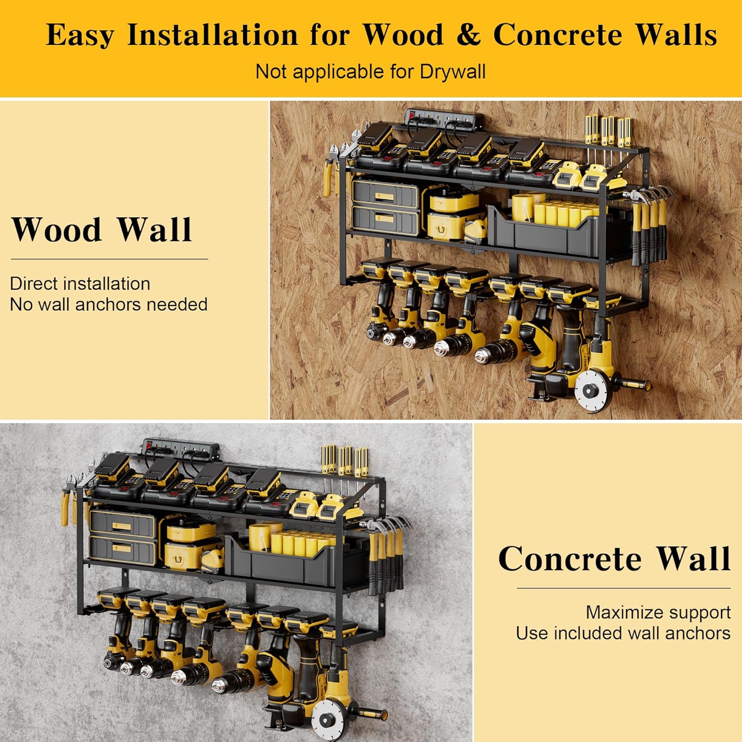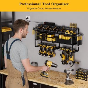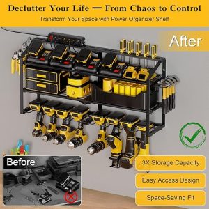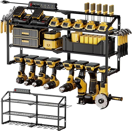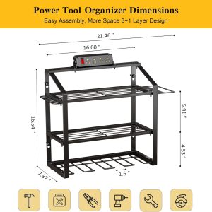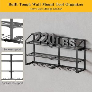 - Heavy-Duty&Durable: Crafted from thickened industrial-grade steel with reinforced full-frame welding, our power tool rack cradles every tool like a reliable partner, supporting 220 lbs. Rust-resistant black powder-coated finish ensures lifelong durability, resisting scratches, rust, and deformation.