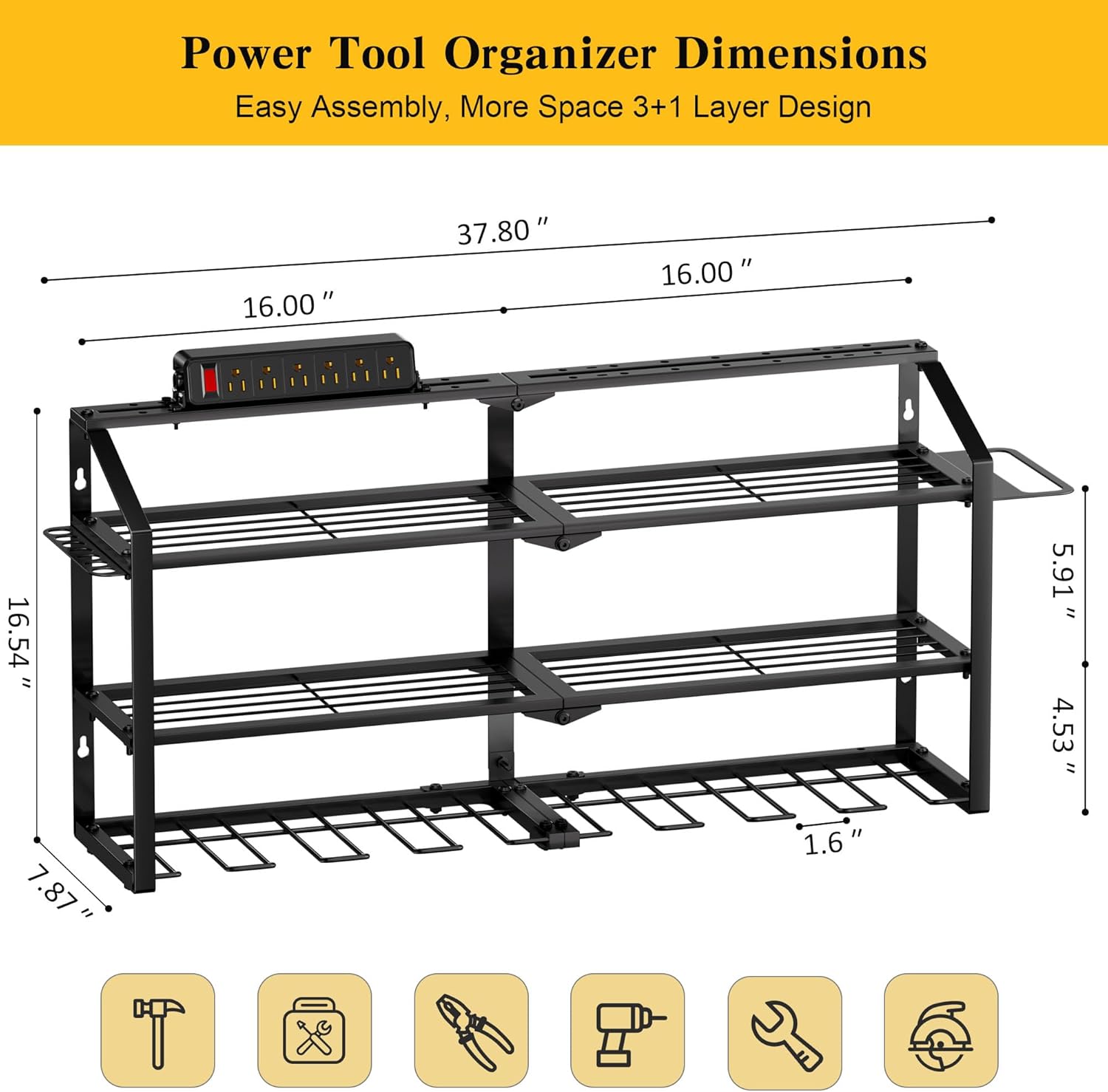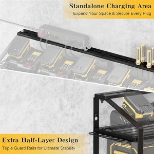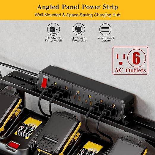 - Built-in 6-Outlet Power Strip: The Spampur Power Tool Organizer with Charging Station charges up to 6 power tools simultaneously. Features an angled panel for easy-access plugging. UL-certified for worry-free safety.Mounted 3.2″ above mesh shelf for space efficiency.