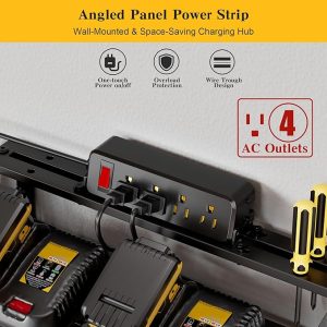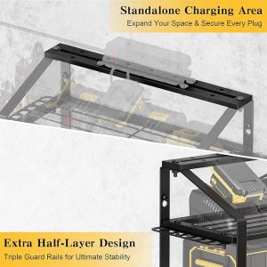 - Built-in 4-Outlet Power Strip: The Spampur Power Tool Organizer with Charging Station charges up to 4 power tools simultaneously. Features an angled panel for easy-access plugging. UL-certified for worry-free safety.Mounted 3.2″ above mesh shelf for space efficiency.