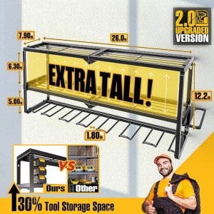 - 2.0 Upgraded version: This wall-mounted power tool holder features the latest high-capacity design, with a tool organizer height of 12.2 inches that offers more space than other tool holders, 6.3-inch mid-tier tool storage that can hold more charging stations and large power tools, and a hammer holder, pliers holder are added to the side